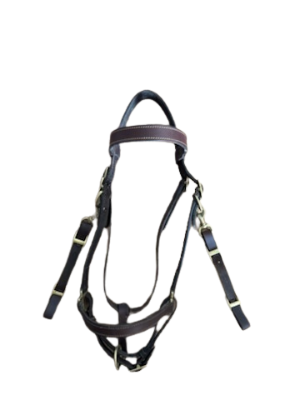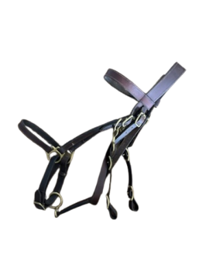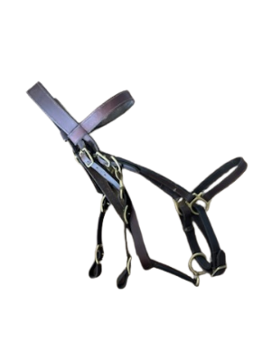 Brown leather 2-in-1 halter bridle in good used condition. Large-size fit with sturdy metal hardware and includes 8′ reins—perfect for trail riding and training.